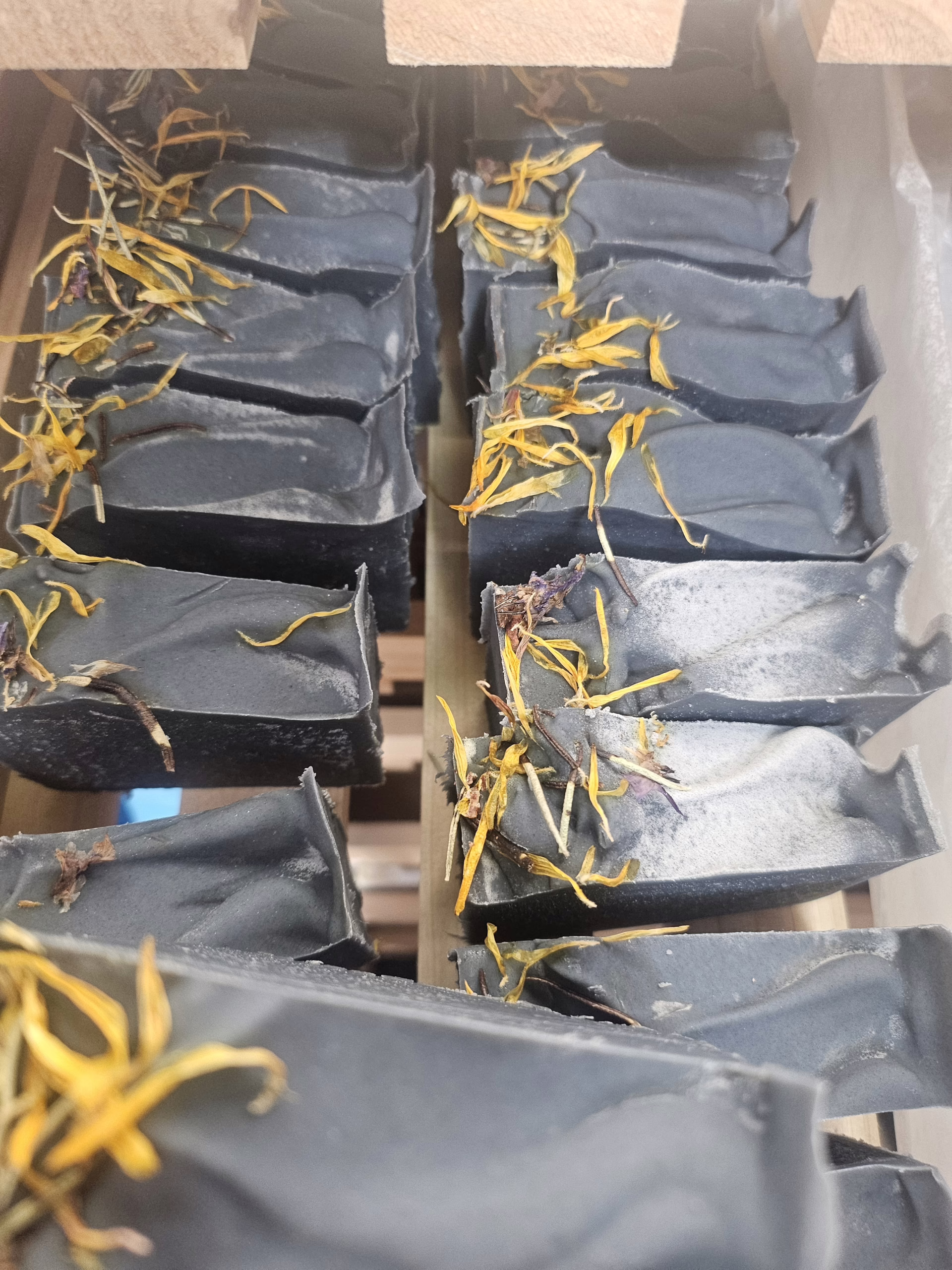 Ingredents | Activated charcoal powder, calendula petals, Castor oil, Cocoa butter, Coconut oil, Lavender essential oil, lye, Olive oil – pomace, Palm oil, Rosemary essential oil, Shea butter, Sweet almond oil, Tea tree essential oil, water |